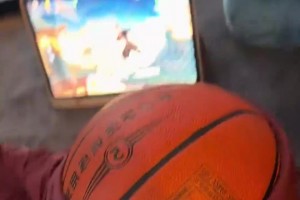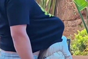 宝宝摸了一下爸爸肚子,爸爸把衣服把他头套住 用肚皮运“球”