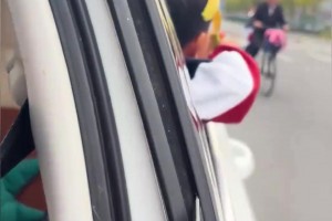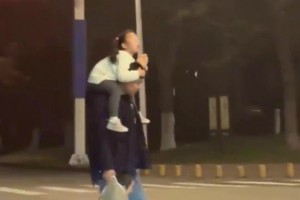 爸爸带俩孩子过马路,女儿坐在肩上 儿子被提在手上