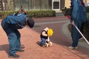 宝宝骑小车车被围观,害羞地把脸埋在车把上 太可爱了