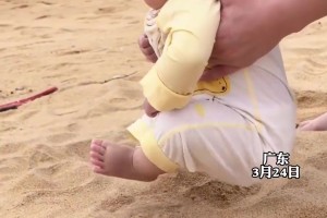 男子想把宝宝往沙滩上放,结果宝宝的脚就是不踩沙子