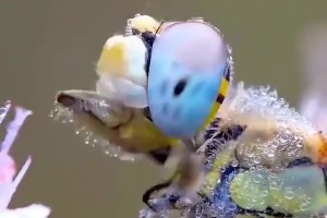 近距离拍摄晨露中的蜻蜓,用触手刮去脸上的露水